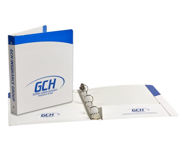 Custom printed paperboard 1″ 3-ring binders with double pockets and reinforced edges. Laminated 3-ring binder. Two 4″ pockets. Reinforced sides, 20pt. paperboard standard.